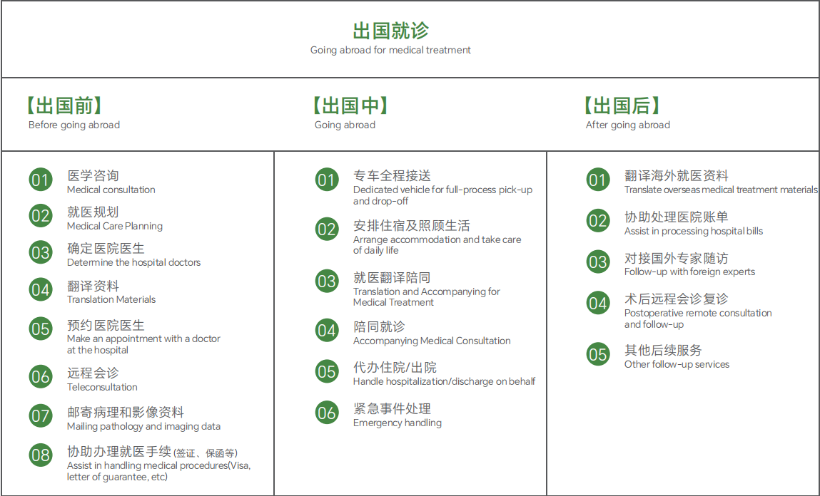 用心打磨每个业务节点,涵盖病情评估、资料翻译、医院匹配、远程会诊、陪同就诊等全链条服务,就医相关事项全面覆盖。