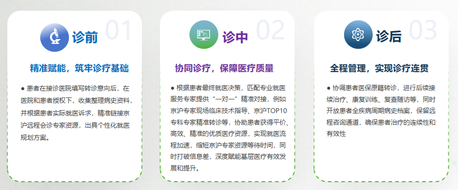 依托三山医伴链接的京沪专家资源,实现“诊前精准规划、诊中高效协助、诊后接续顺畅”,同时尽可能实现异地医疗机构检查检验结果互认、患者主要医疗消费留在医保原籍地、最终实现患者疾病治疗周期的连续和稳定获益。