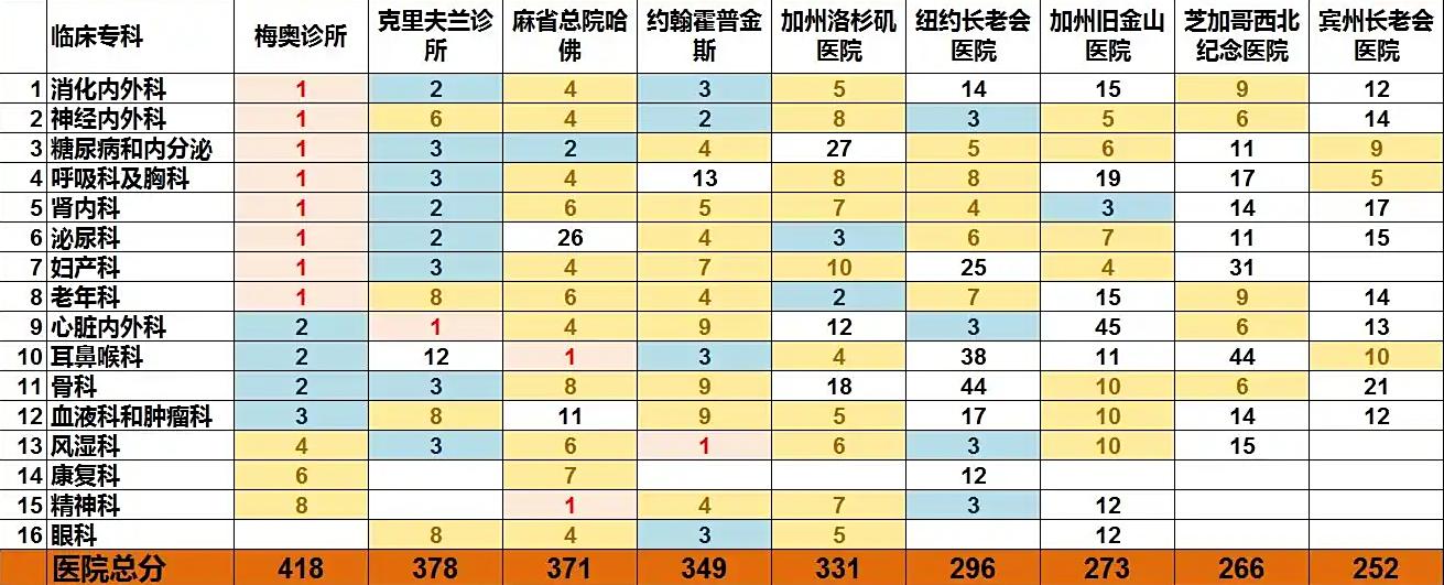 医院排名考察的是综合实力,而到了具体专科层面,梅奥的表现更是惊人。有一项针对美国知名医院临床科室实力的排名,在16大主要科室中,梅奥诊所独占8项第一、12项前三,展现出了所谓碾压级别的统治力。